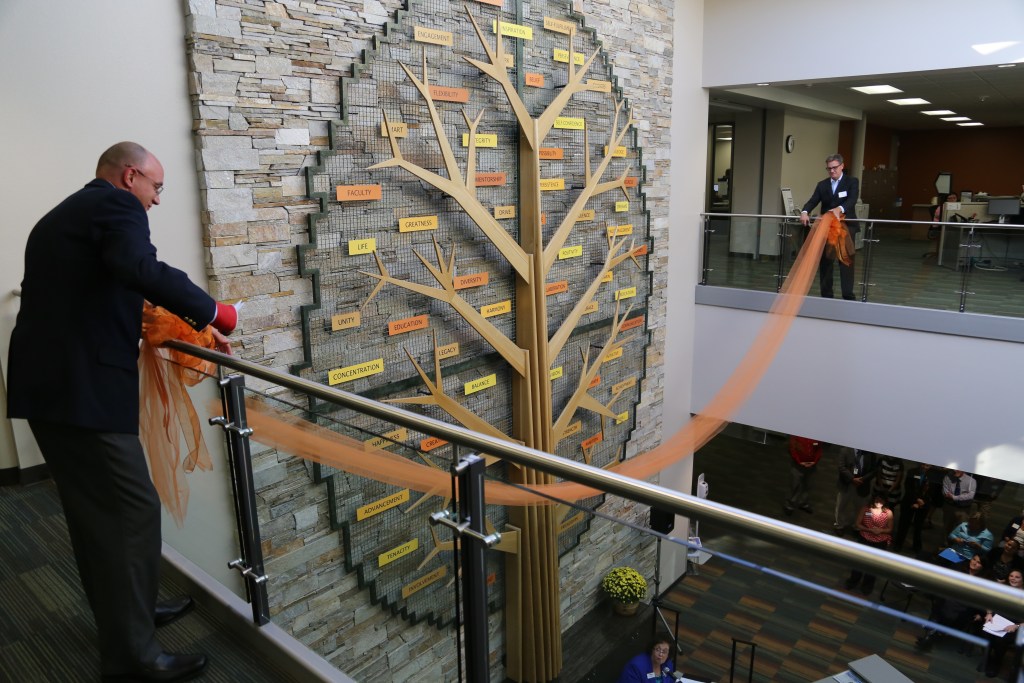 Two centerpieces of the SSC include the KI Innovation Center—a four-room continuum of open-space classrooms on the second floor designed to enhance soft skill development in communications and teamwork in a collaborative setting, equipped with multi-media technologies and wall-to-wall and tabletop marker board provisions, and the Tree of Success—a 24 ft. art sculpture made of wire mesh and a smooth wood finish courtesy of students in FVTC’s Wood Manufacturing Technology program. The Tree of Success, a first-floor fixture, is full of simulated fruit that depicts one-word concepts on what success means to students at FVTC.
