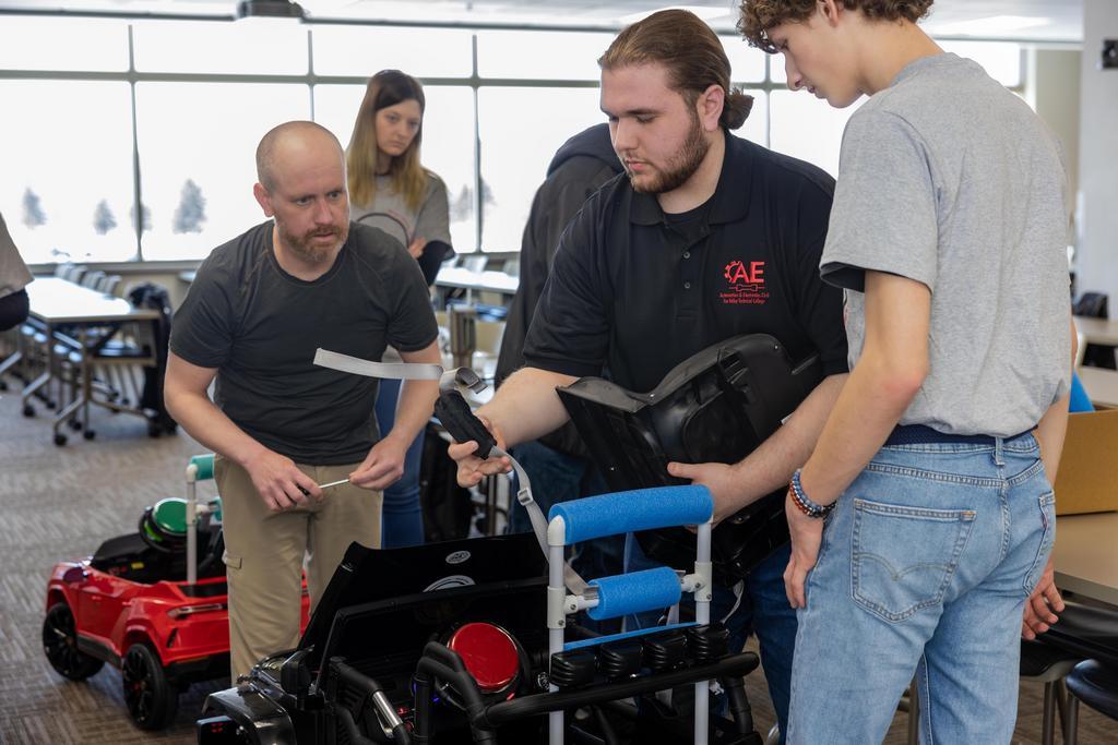 “We take a base car and then we do things like change the wiring up a bit. We can add a little box, which is a relay that comes with a controller, so the parents can control the car as well as the child,” explains student Jackson Hoerth. “Instead of having the foot pedal, we also have a big button on the steering wheel which makes it easier for them to use. We add protective padding and harnesses to keep the child safe.”